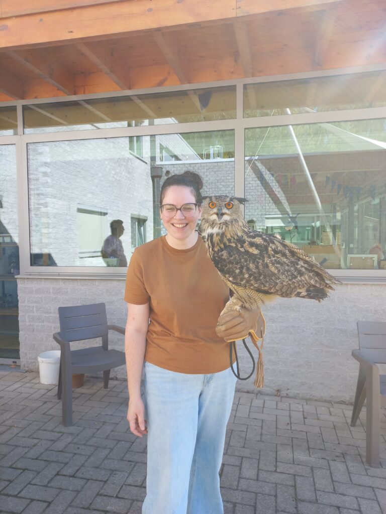 Alles gebeurde uiterst veilig, met respect voor dier en mens. We leerden onder andere hoe stil een uil vliegt en wie wou, mocht — onder begeleiding — zo’n indrukwekkend beest op de arm voelen.